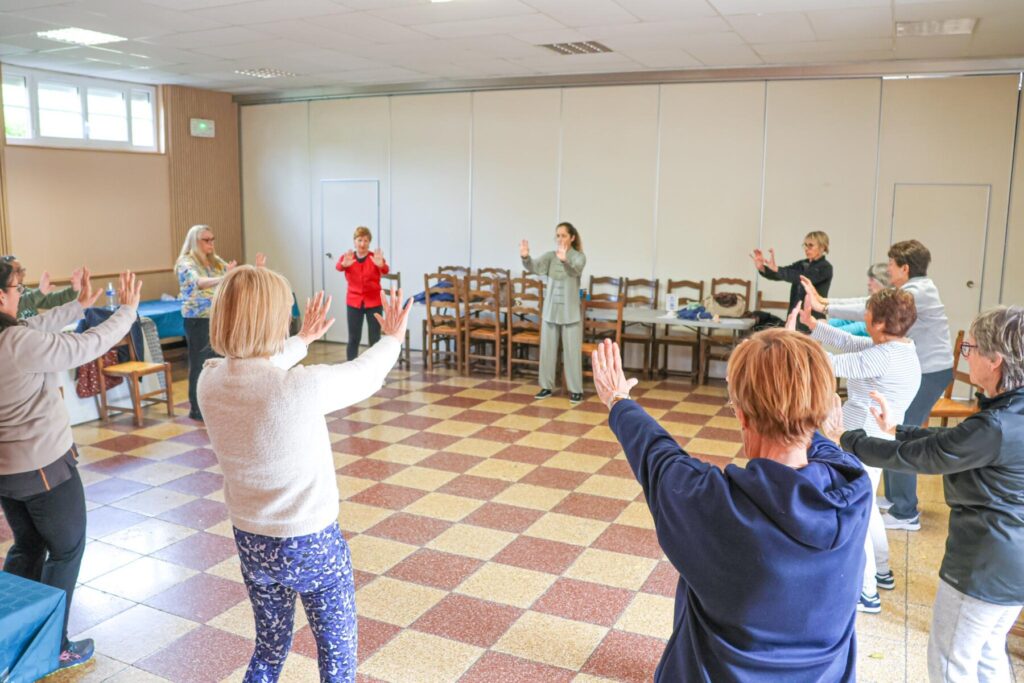Place ensuite à la pratique. Dans la salle, les corps se remettent doucement en mouvement. Taï-chi, stretching, exercices d’équilibre… Les ateliers s’enchaînent dans une atmosphère à la fois studieuse et détendue.