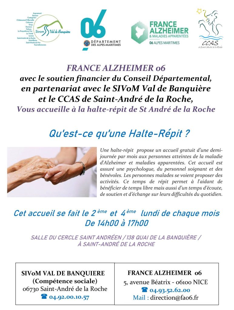 Accueil de 14h à 16h à la Salle du Cercle Saint-Andréen (Quai de la Banquière – 06730 Saint-André de la Roche).